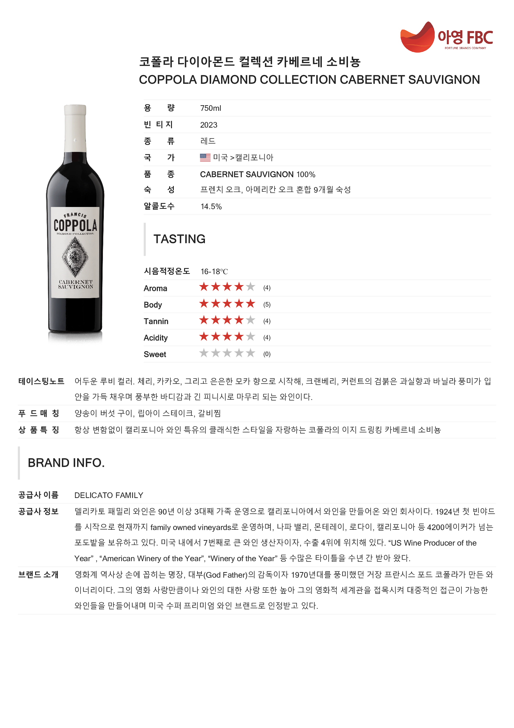 항상 변함없이 캘리포니아 와인 특유의 클래식한 스타일을 자랑하는 코폴라의 이지 드링킹 카베르네 소비뇽