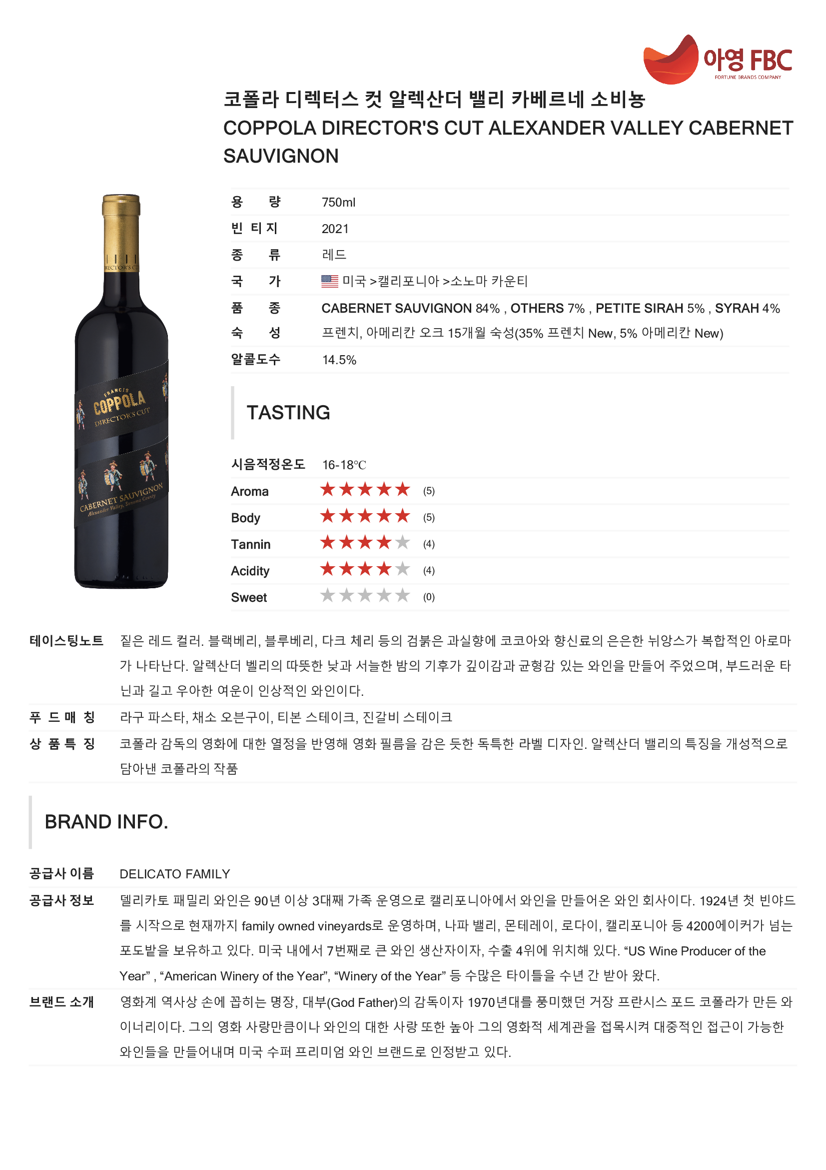 코폴라 감독의 영화에 대한 열정을 반영해 영화 필름을 감은 듯한 독특한 라벨 디자인. 알렉산더 밸리의 특징을 개성적으로 담아낸 코폴라의 작품
