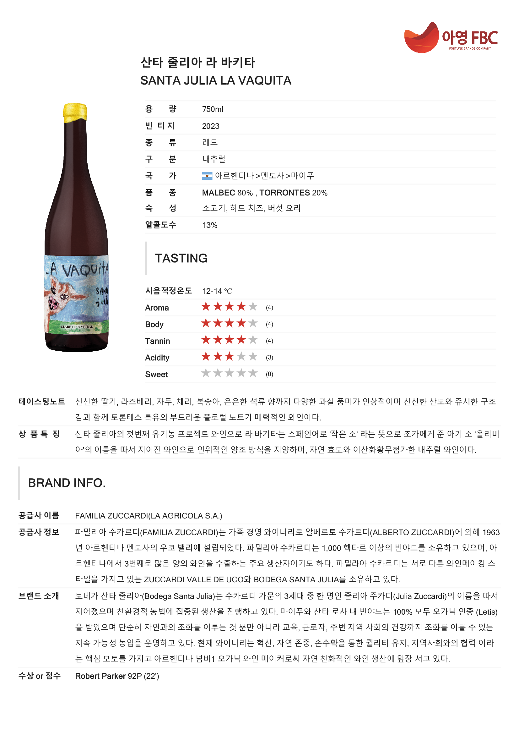 산타 줄리아의 첫번째 유기농 프로젝트 와인으로 라 바키타는 스페인어로 '작은 소' 라는 뜻으로 조카에게 준 아기 소 '올리비아'의 이름을 따서 지어진 와인으로 인위적인 양조 방식을 지양하며, 자연 효모와 이산화황무첨가한 내추럴 와인이다.